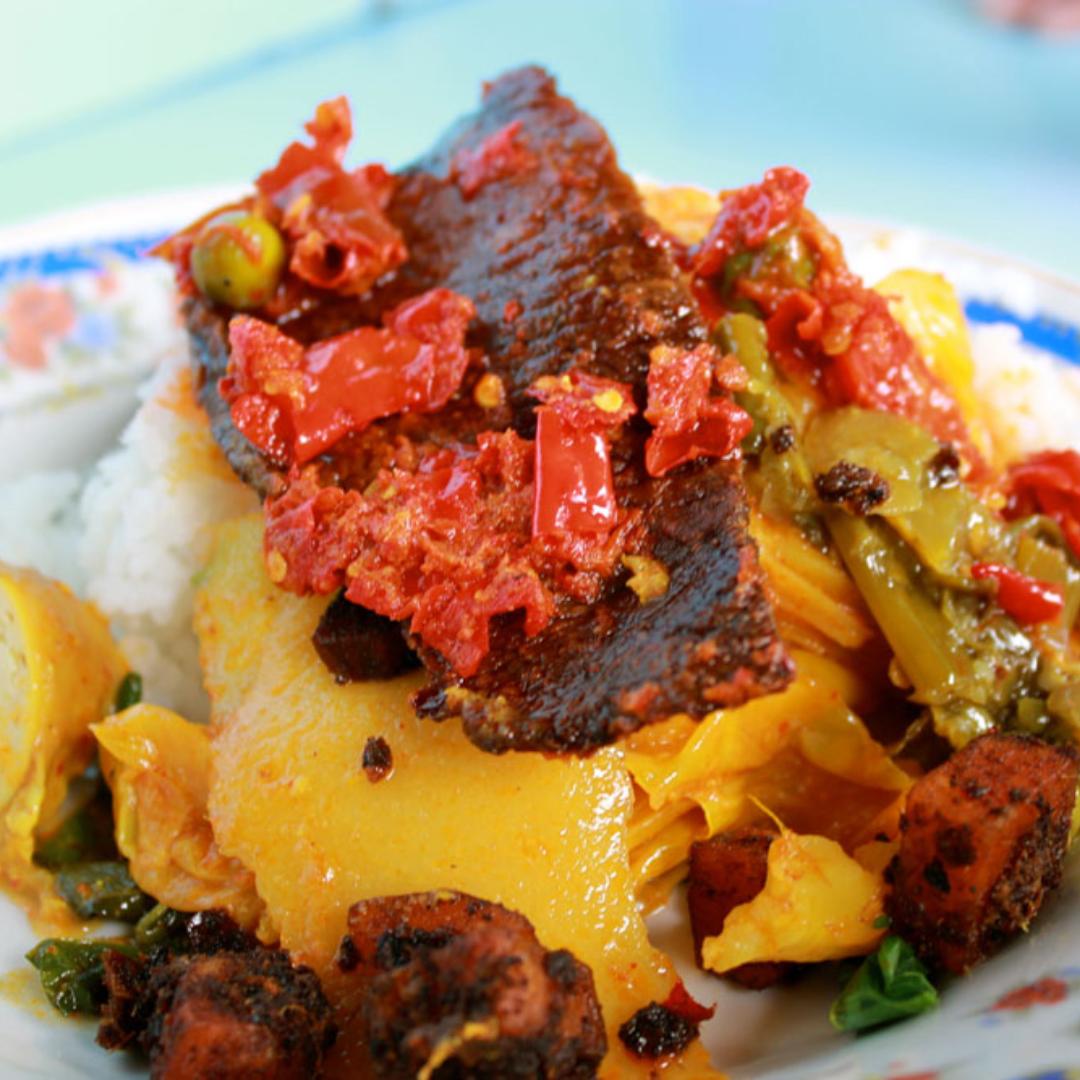Disajikan dengan nasi putih hangat, gudeg ini menghadirkan nangka muda yang lembut, berpadu dengan areh kental yang gurih. Pelengkapnya pun lengkap—ayam, telur pindang, sambal krecek pedas, hingga tahu-tempe bacem—semuanya menyatu dalam cita rasa nusantara yang autentik.